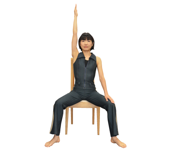 ②息を吐きながら上体を左に傾ける。そのまま20秒数える。 上体を起こして両手を大腿の上に置く。まぶたを閉じて、伸ばした右側面の心地よさを感じる。 反対側も同様に行う。