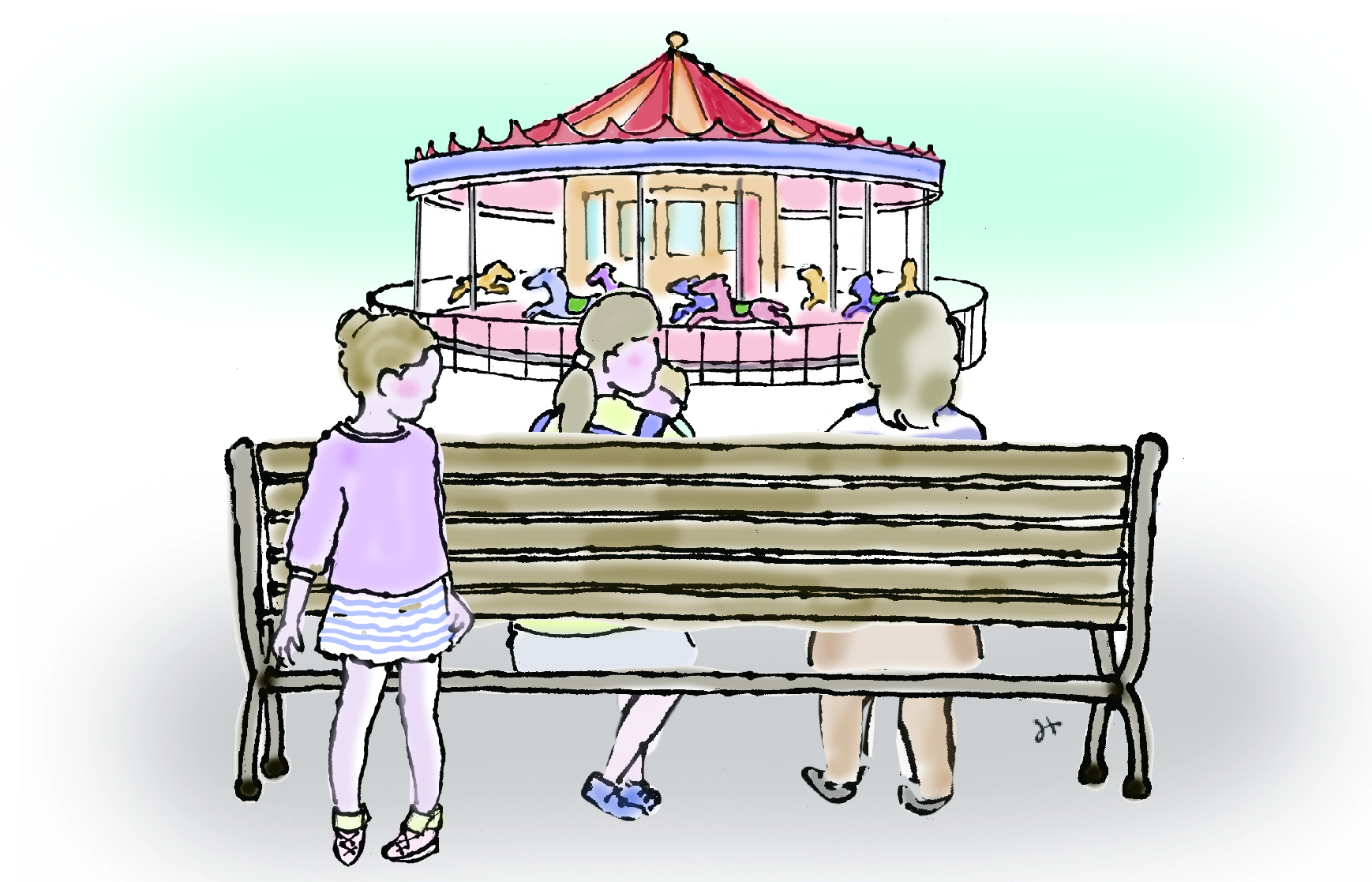 そして、うっそうとした木々の緑の中に見捨てられたようにあるこの回転木馬をベンチに座って、
